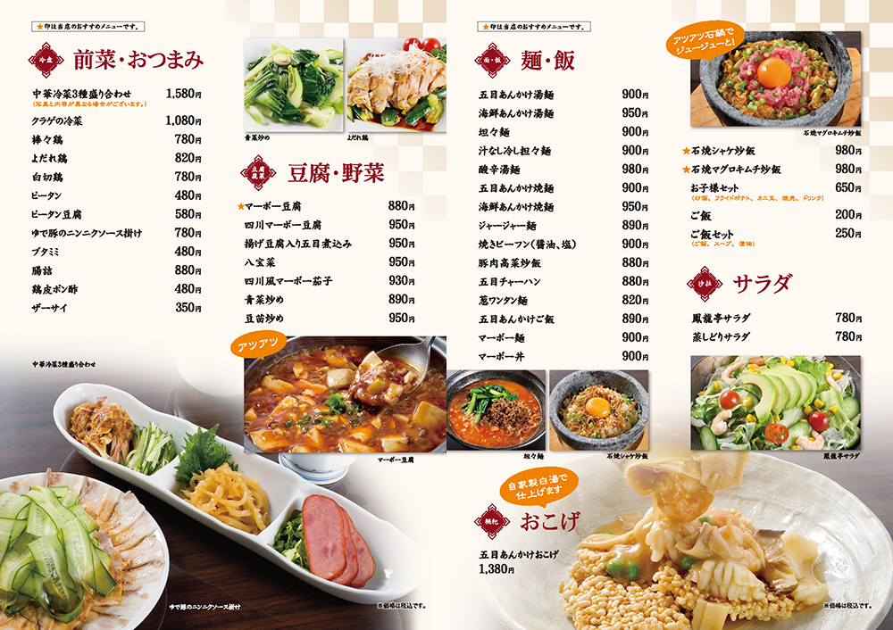 当店は落ち着きのある雰囲気のため、お客様は40才以上の方が中心となります。ですから舌の肥えた方が多いのですが、お客様からのご注文はメニューに掲載されている写真の料理がよくでます。やはり写真が良いとご注文していただけますね。特に「マーボー豆腐」が大人気です。