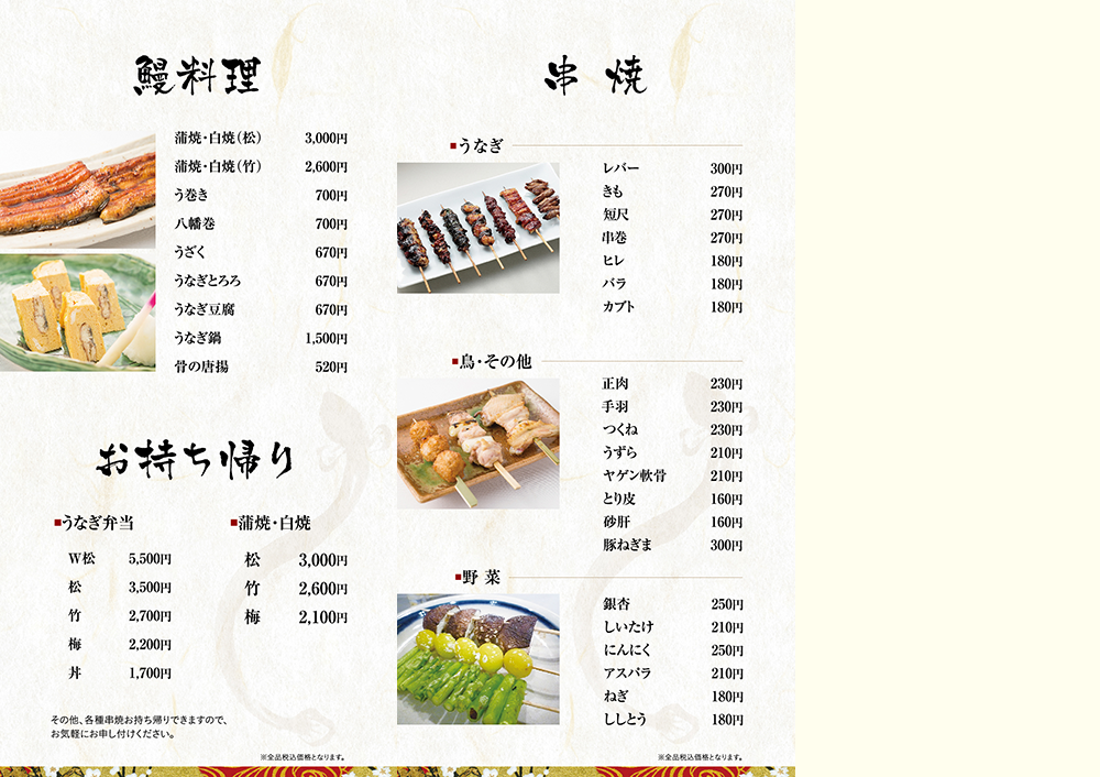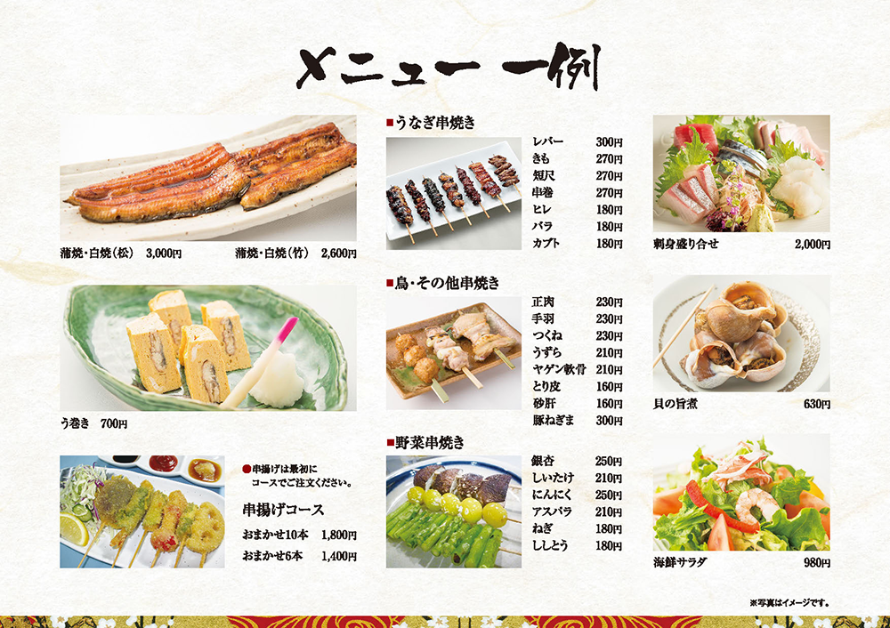 当店の人気メニューは、うなぎの串焼とうな重です。とくに串焼は、創業から根強いファンが多く喜ばれています。今後も店舗のリニューアルなども控え、またメニュー改訂も行われる予定です。その際にもお願いしたいと考えています。