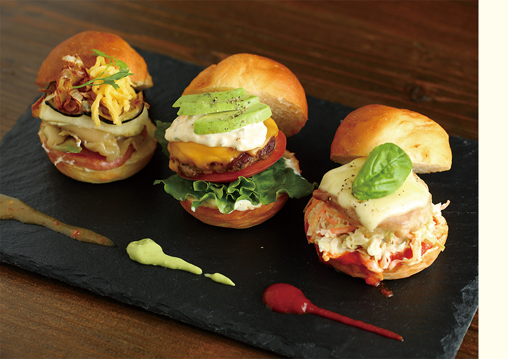 ▲人気メニュー「スライダー(一口サイズのハンバーガー。16種類の中から色々な味を選べる)」