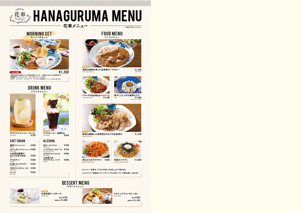 オープン当時『仙景プラザ』併設のカフェ『花車』は、手書きのメニューを使用していました。その後はパソコンを使用し文字と自分たちで撮影した画像を組み合わせてメニューを作成していました。