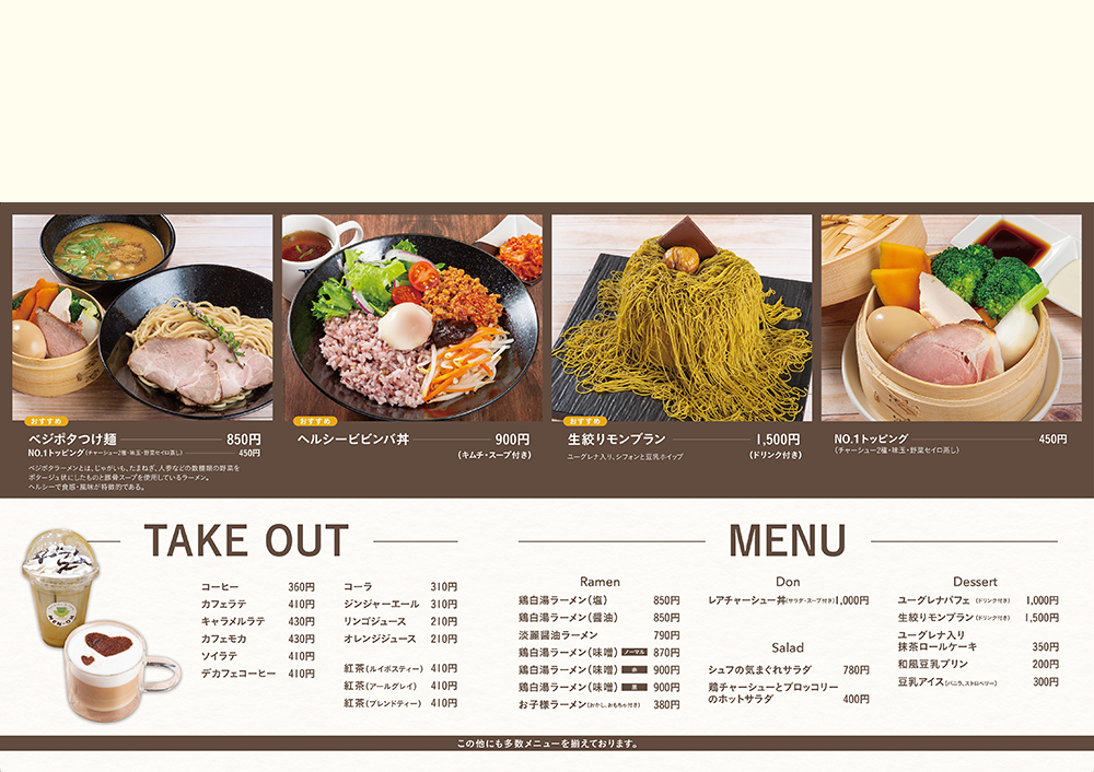 当店は「健康」と「SDGs」な飲食店です。またユーグレナを使用したり、地元の麗澤中学・高等学校の「SDGs研究会」の学生さんにも参加いただき、創り上げてきたお店です。これからも地元に密着し“健康重視のらーめん & Sweets Cafe”を展開していきます。