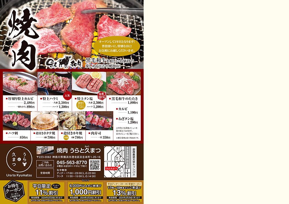 神奈川県東急東横線日吉駅から歩いて1分のところにある「焼肉 うらと久まつ」様。