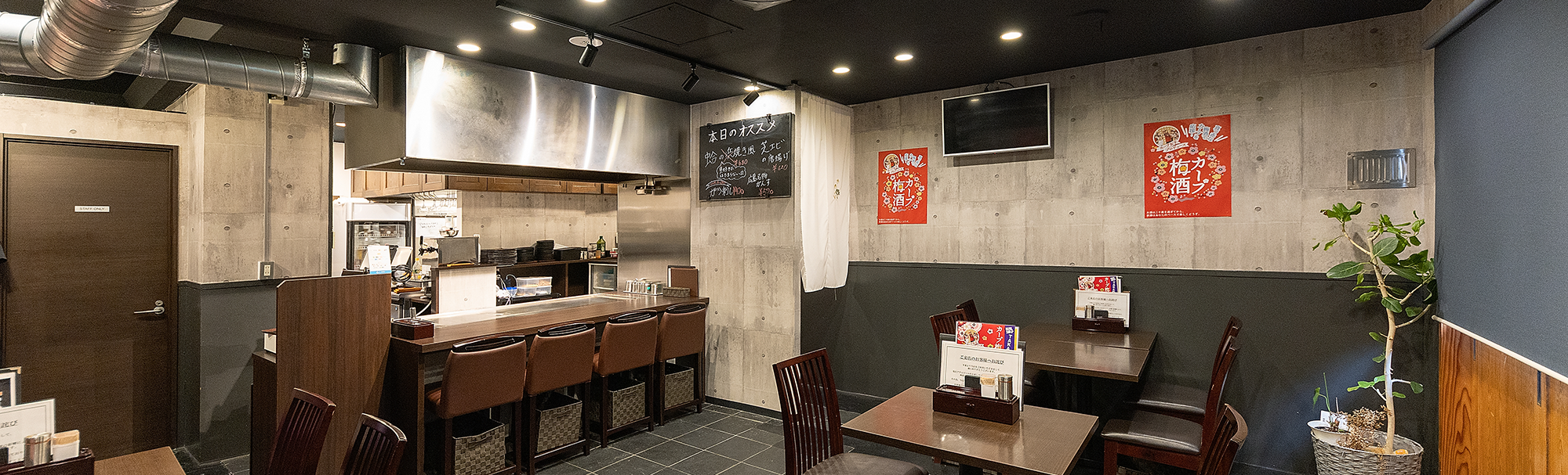 メニュー制作工房では、2月のオープンに向けてロゴデザイン、オープン告知チラシ、メニューデザイン、ユニフォーム(ポロシャツ)、A2オープン告知ポスター、ショップカード。2月にのれん。4月に屋外店頭看板(A看板)の制作をお手伝いいたしました。