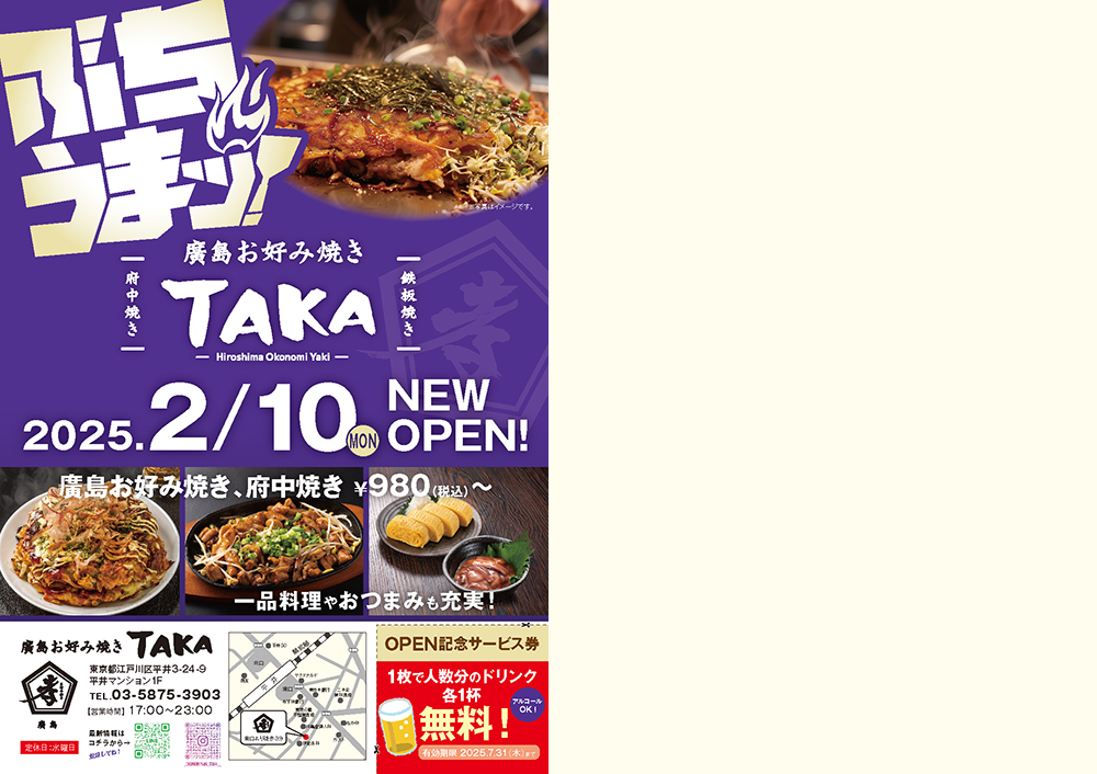 2025年2月10日に総武線平井駅から徒歩3分のところにオープンしました「廣島お好み焼きTAKA」様。