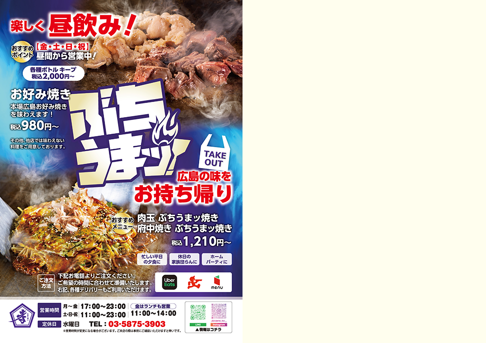 こちらの制作も歩いている人を呼び込みたいので、「テイクアウト」と「昼飲み」というコンセプトをお伝えしたら思い通りのデザインを短時間で仕上げてくれ助かりました。